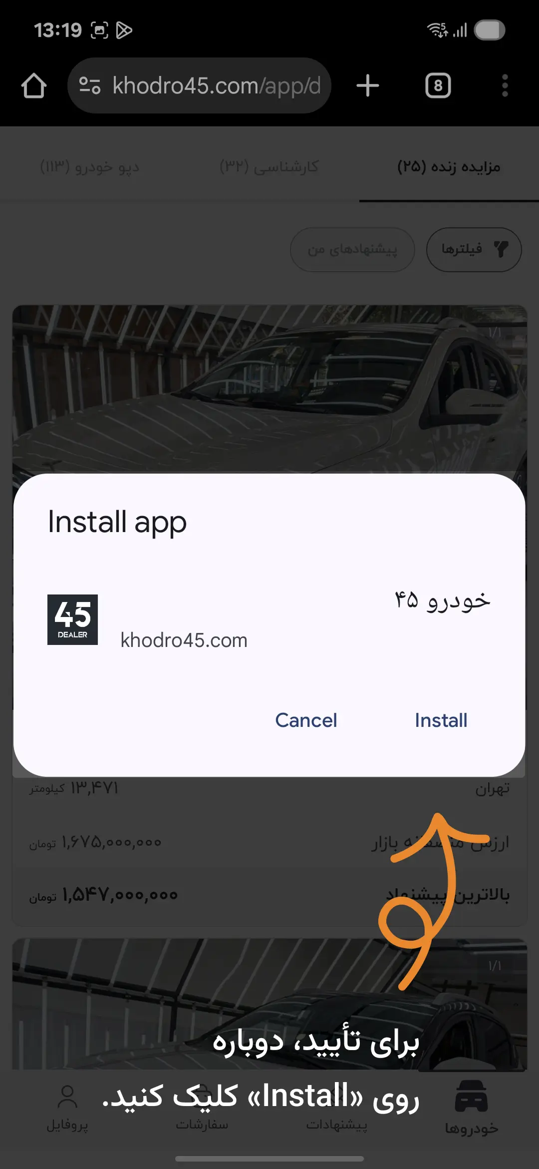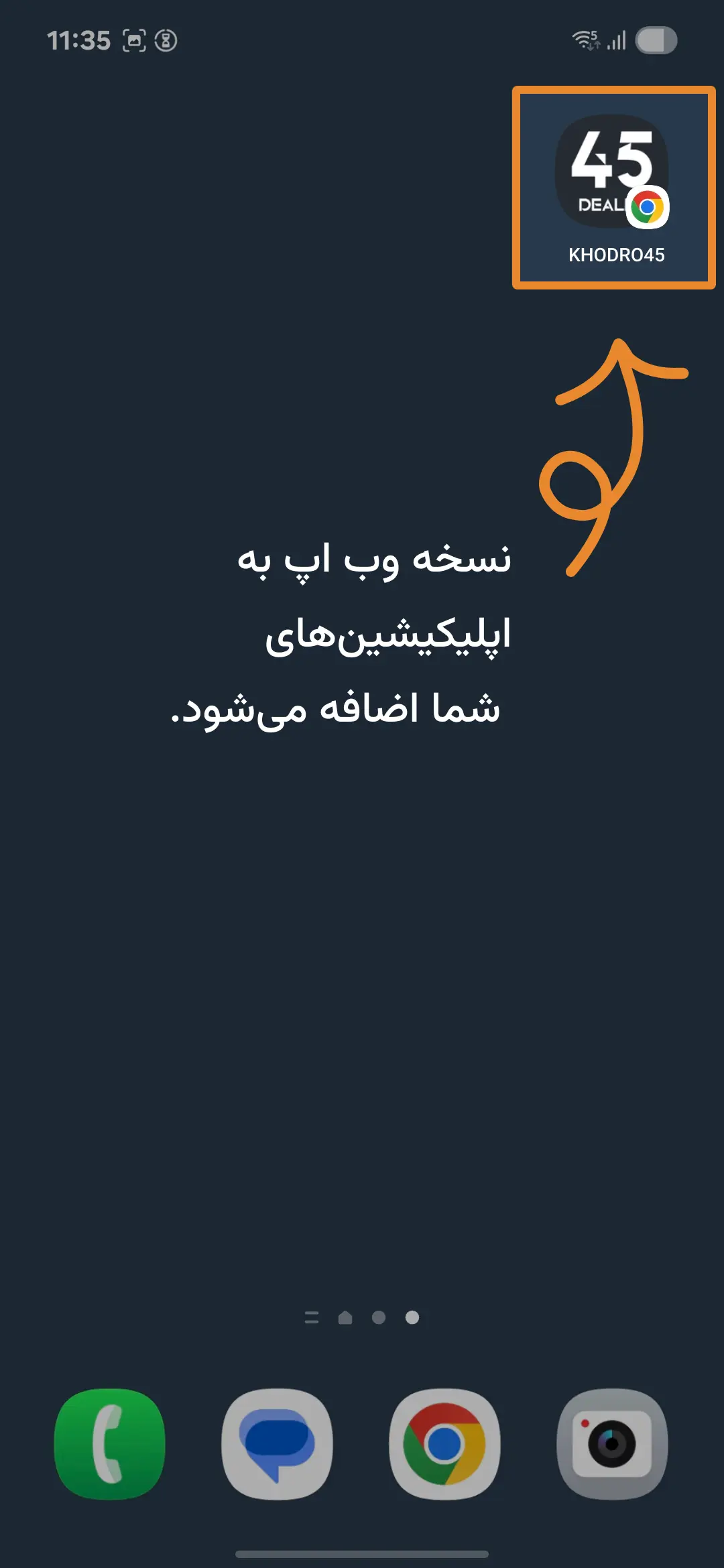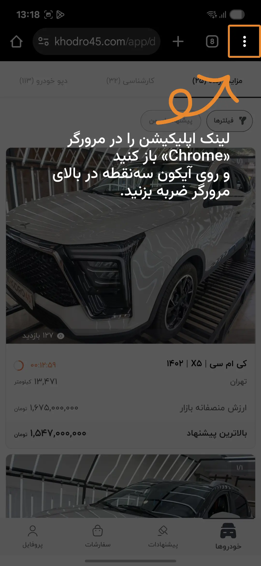 لینک اپلیکیشن را در مرورگر Chrome باز کنید و روی آیکون سهنقطه در بالای مرورگر ضربه بزنید.