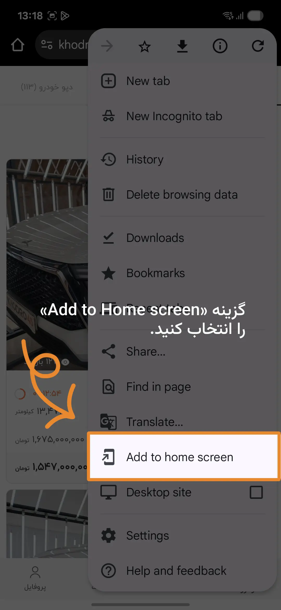 گزینه "Add to Home Screen" را انتخاب کنید.